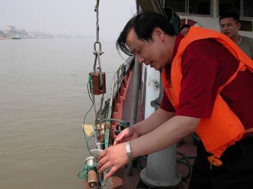 引江济江取水口可行性水文测验指挥长、水文荆江局局长唐从胜正在统计各断面测验数据