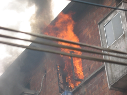 只见通衢路中段一栋三层旧楼的三层一住户家中起火,滚滚的隆烟和火苗从窗内飘出,火之大不是水桶或灭火器可以扑灭的。一会消防车就到了,他们响应迅速,动作熟练,冲在前面的还带上防烟的器具,很快水柱就开始朝火射出。很快就压住了火势并扑灭,火只烧了一家,无人员伤亡,不过屋内已基本烧光,对邻居也有很大影响。