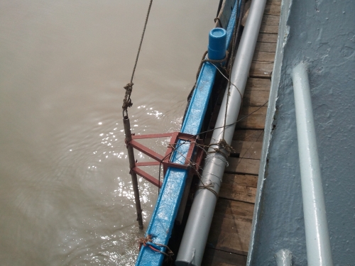 安装ADCP是一个细致活,几根螺杆不容易把支架固定在船舷上,且ADCP受到水流冲击后支架容易松动,几个船员在安装支架时有点不耐烦,略有怨言,测验组成员与船员积极沟通,耐心地给他们分析安全作业的重要性,要求他们用铁丝加固支架,并为ADCP在水平和竖直方向各加装了一根安全绳,为ADCP做了三道保险。