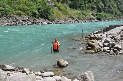 9月23日上午,独龙江水文站站长李明在日常的仪器站房巡查中,发现由于人为破坏,原来设置的低水水尺P6被人为破坏掉了,低水以下人工无法观测,虽然现在主要是以水位自记仪器为主,人工水尺只是不定时的起到校核自记仪器的作用,但是该站仍然将这些小事当成头等大事来抓。中午,该站就及时的设置了一根新水尺桩P7,而且在布设过程中严格按照荆江局安全规章制度来办事,水下作业穿好救生衣、下水裤再下水打桩。很快一根牢固的临时水尺桩就已经设好,该站马上对新水尺桩高程进行了施测。