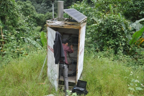 一看时间都12点了,一个上午就这么耗完了。取完数据倒是用了没有几分钟,然后对仪器进行了一次简单的比测,检查了一下配置参数,上次来取数据发现仪器房里有点漏雨,这次来就专门配了玻璃胶和玻璃胶枪带过来了,但没有想到需要补漏的地方太多,一罐玻璃胶远远不够用,只好先将几个主要的地方用玻璃胶封起来了。忙完这些又去原来的老水尺断面处查勘一下情况,一路上还遇着几个背着东西走路回缅甸去的缅甸人,李明试着用学的缅语跟他们对了一下话,没有想到他们还真把他当成缅甸人了。