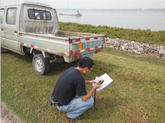 3日一大早,我赶到沙市分局沙市水文站报到,此时该站职工正在为出测前作准备。分局局长吴世勇精心布置,对人员进行了详细的分工,再三叮嘱大家注意安全。紧接着,对所有仪器和工具仔细检查无误后,率领测量小组出发了。吴世勇用手持GPS导航,穿越荆棘和乱石堆,仔细寻找水准点,然后再转告小组。中午12点多钟,大家就地吃完午餐,来不及休息,继续投入到测量中。