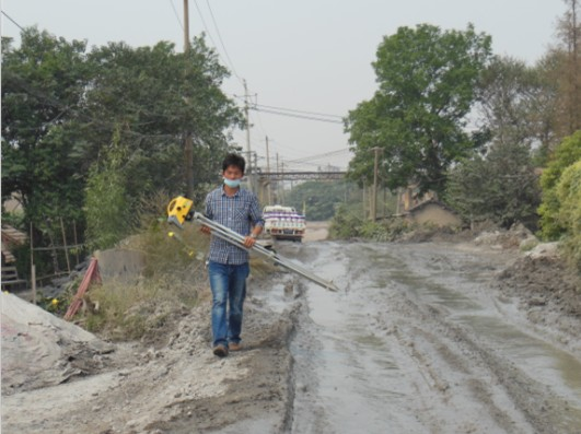 测量途中要穿越车辆、行人和批发市场,既要保证人身安全,又要保护好仪器。虽然该仪器使用方便,但有的时候却和人“较劲”。诸如光线太强、太暗、大风等,都不能读数。这种情况时有发生,有时一站要架设几次才能合格。我们所测的路线大多紧靠江边,运送粗沙和卵石的车辆川流不息,漫天飞舞的灰尘无情地向我们扑来,眼睛、耳朵、嘴里全是尘土。这给测量带来一定影响,大家一路前行,任凭风沙侵袭,默默忍受着。