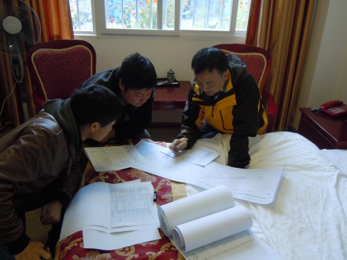 12日下午,长江水文水资源分析研究中心副总工程师蒋鸣抵达测量现场,对滇中引水工程可研阶段水文测验工作进行现场指导。到达测区当晚,蒋鸣便召集测量人员详细了解测量工作的进展情况,对本次任务的基本情况进行简单介绍后,他又就任务内容的布置与要求向大家进行了细致的解释,对关键环节进行了重点强调。因有近60个断面是在原任务的基础上新增的,蒋鸣结合设计图纸,对所有断面进行逐个梳理,对测量人员存在的疑虑现场给予了解答。
