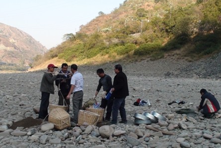 隆冬时节,拉鲊河段的清晨寒气侵人,江水刺骨,但中午卵石滩上的气温却高达28度,温差高达二十多度。下午6时许,全体勘测人员才汗流浃背地回到驿站,金沙江的冰火两重天让他们终身难忘。
