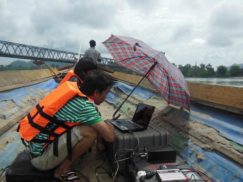 6月12日,水位持续上涨中,密松水文站职工火速赶往密支那(流)施测ADCP流量。烈日下,大家穿好救生衣、做好一切安全措施,各施其职,很快进入测前状态。主测人员一声令下,船长立即开船。江面漂浮物较多,为防止杂物碰撞到仪器,双方之间不断进行着沟通。在所有工作人员共同努力下,流量施测最终圆满完成。
