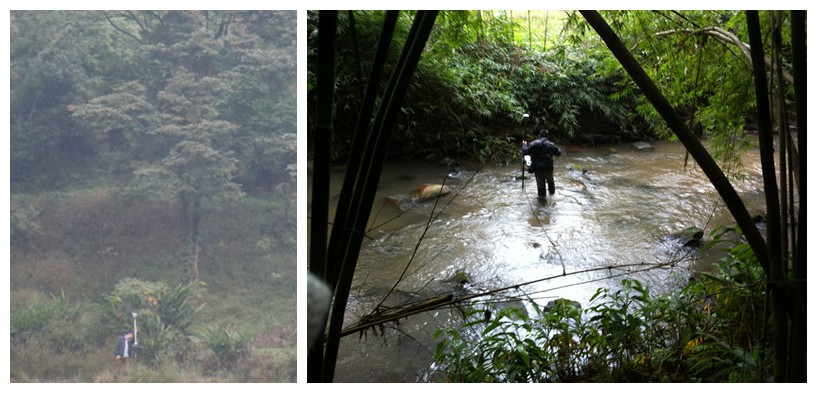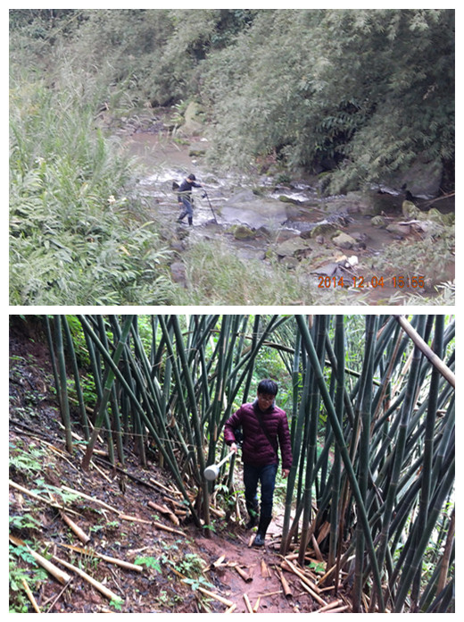 测断面,秦志维、冷阳、刘瑞斌和魏轩下水了。断面测量小组需要对河流进行三横一纵四个断面进行测量,随着调查区地形地势的升高,大多数是山高河低,河流两岸长满竹林和齐腰深的杂草或是水稻田,给测量人员的行走带来极大不便,仅有20米宽的河流测量人员却要翻山过涧才能到达河的对岸,身处密林中的队员真正做到了“只闻其声,不见其人”。山间的河流弯道多、距离长、坡降大,有些地方无法达到水边,不仅如此,由于河底所在地势很低、竹林茂密,往往走到了所要测的点位仪器却收不到信号,只能反复调整测量点位收取信号,这无疑又耽误了测量的时间。