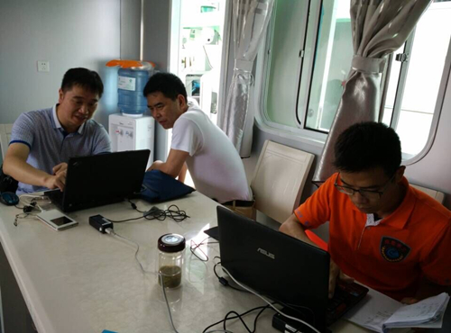 随着东方之星客船整体扶正,水文监测工作进入到关健阶段。上午,水文荆江局应急队各监测点数据正在汇总,现场技术组与后方技术组密切配合,确保了上报监测数据及时、准确、可靠。