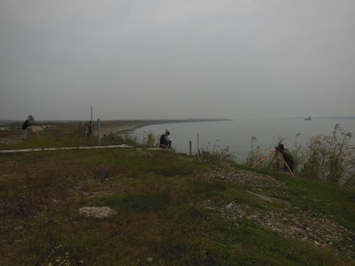 测量中,天空阴霾,冷风阵阵。有时测得正起劲,天空突然就下起了大雨。马路上过往汽车、行人多,为了保护测点,有的同志来不及拿雨伞,就这样守护在地钉旁,司仪人员脱掉外套罩着仪器,任凭雨水冲刷自己,一直到雨停了,才继续前行。测到长江边,大风夹杂浪花拍打着岸边,让人阵阵寒颤,大家裹紧衣襟聚精会神地继续配合工作。
