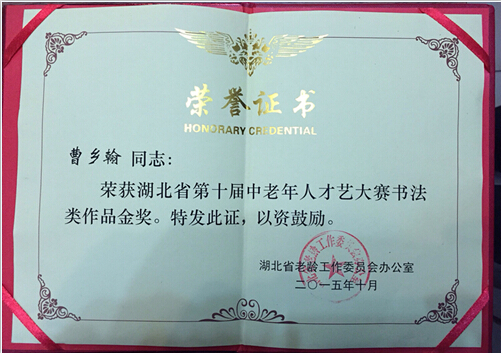 12月17日,水文荆江局诗联书画组传来好消息,该小组成员曹乡翰同志荣获湖北省老龄委颁发的第十届中老年人才艺大赛书法类作品金奖。