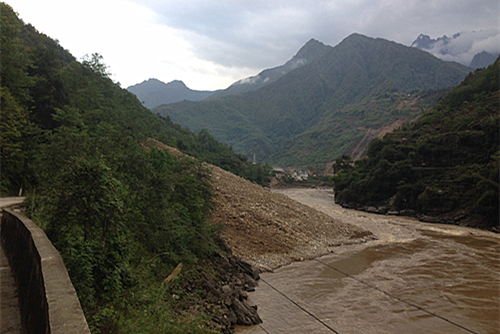 图1 贡山县独龙江乡的基岩滑坡,毁坏公路护栏和路基